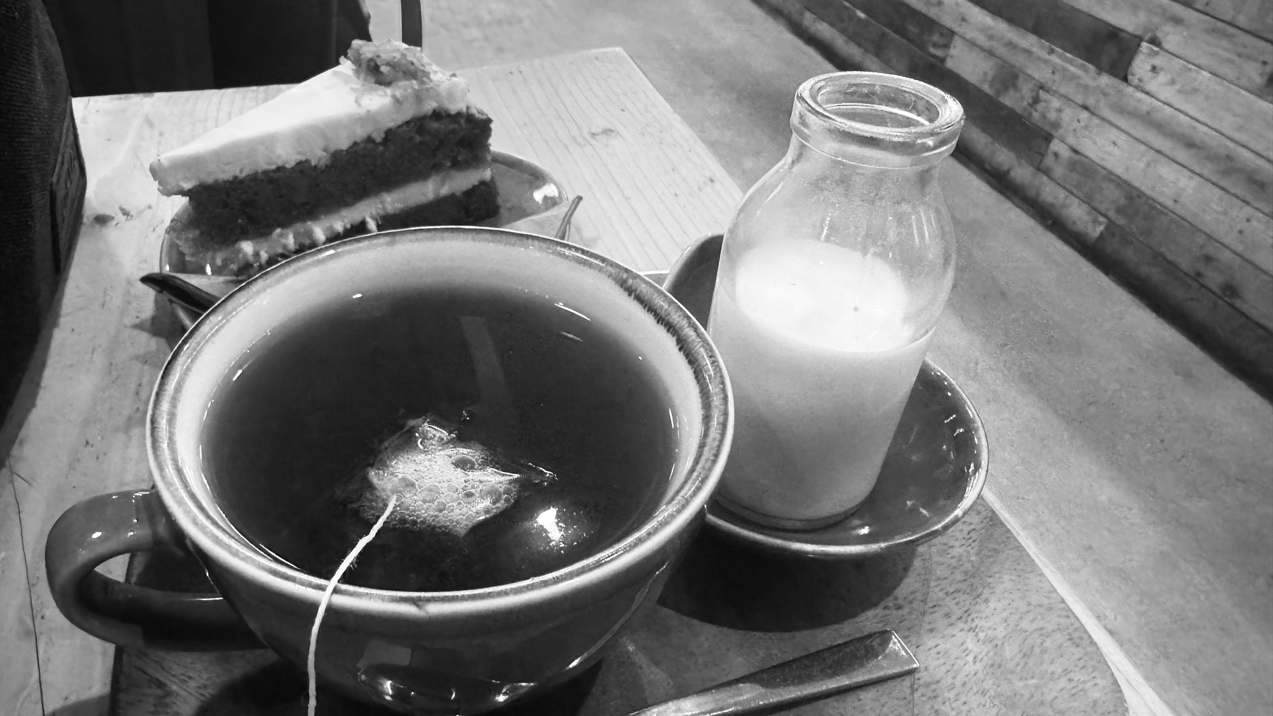 I’m a coffeholic but even I have limits. I’ve had five large Americanos so far today, so on my break, I opted for a cup of tea to go with a slice of carrot cake.