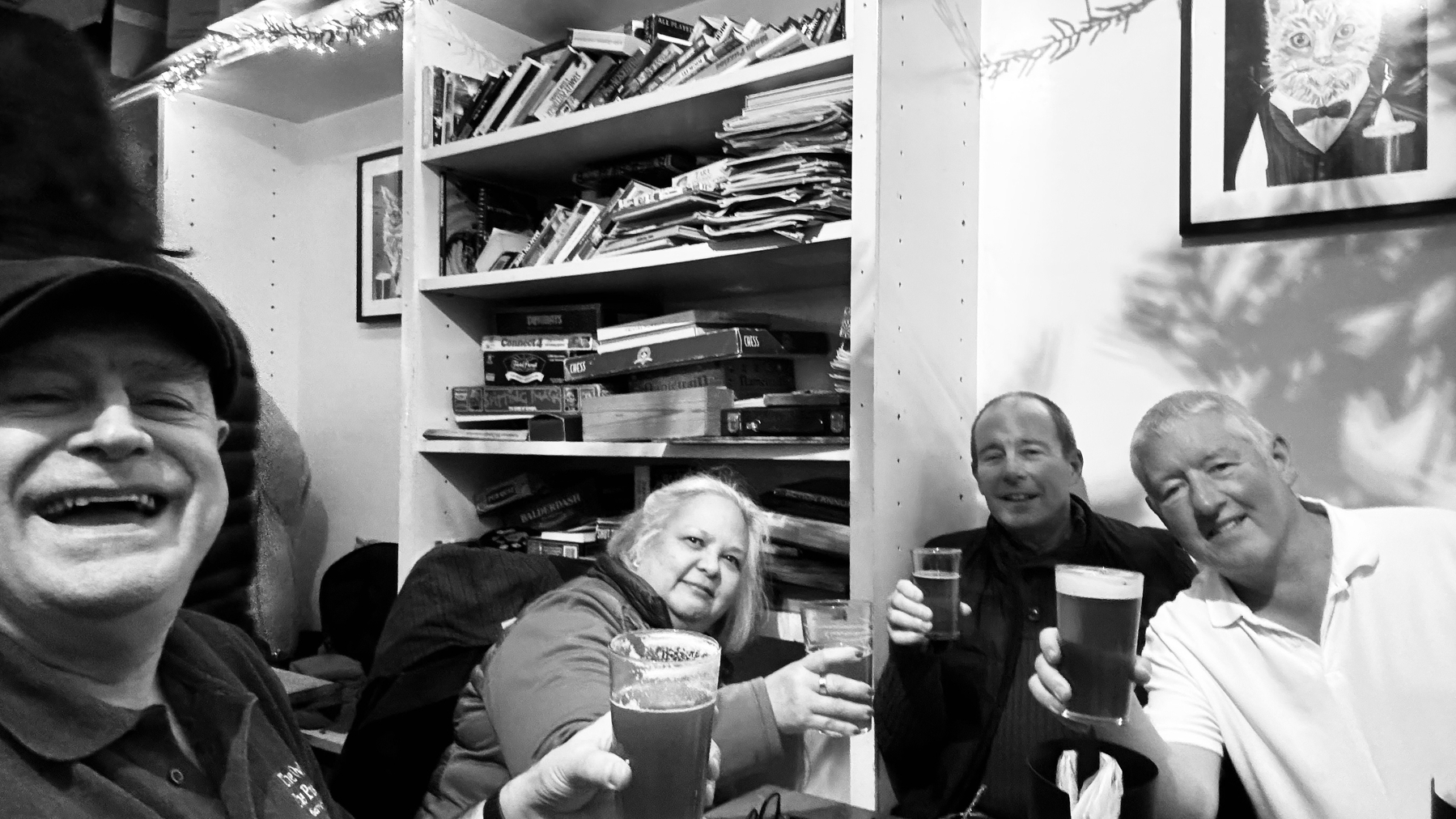 I left home at three. The O&P opens at four. I wanted to get some cheese in the deli next door first. I did that, and when I came out, Tim and Dennis were there too. We all went in together. We had several beers. Kathy got there soon after six. We had a couple more drinks, and then we all went to Monty’s for some food. We spent a good couple of hours in there. We went home on the bus and train, and got indoors around ten thirty.